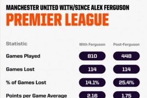 体育资讯4月6日讯 Opta统计了弗格森执教期间以及后爵爷时代曼联的英超数据,并做出对比。如果曼联在今晚的德比战中落败,后爵爷时代输球场次将超过弗格森执教时期。